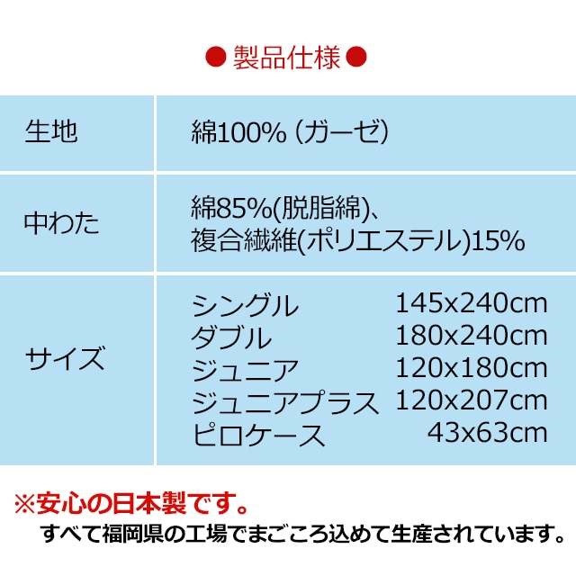 | こんな方に おすすめ | ・コットンの肌触りが大好きな方 ・化繊接触アレルギー、敏感肌の方 ・ダニ・ハウスダストアレルギーの方 ・汗かきの方 |