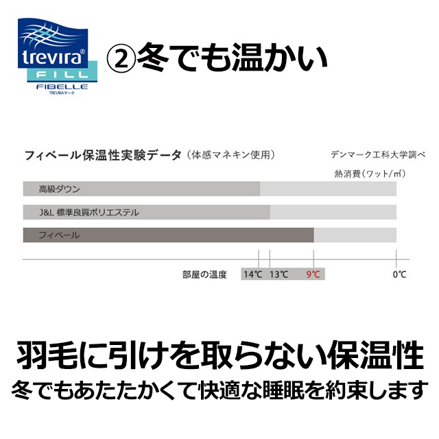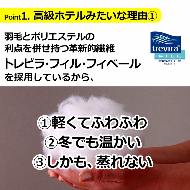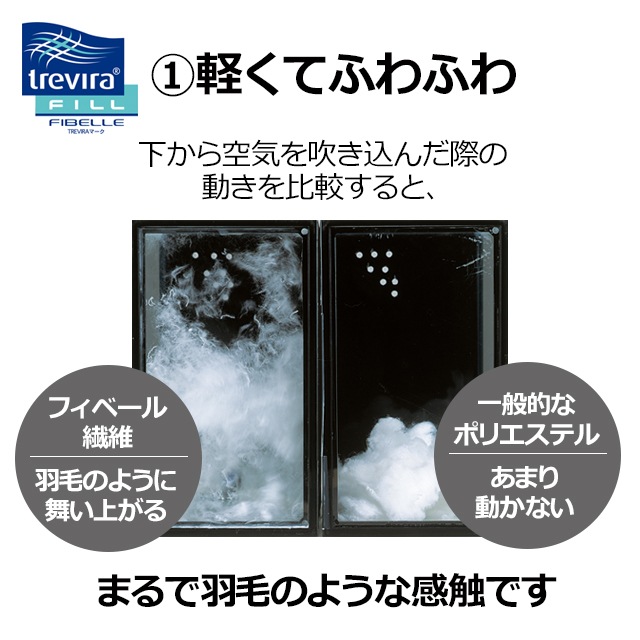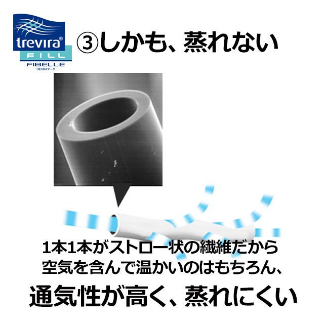短繊維で中が空洞になっているため、空気を中まで取り込んでふんわり柔らかいのが特徴のトレビラフィルフィベール。羽毛に負けないほど軽く、いやな臭いもありません。 特殊加工を施した繊維トレビラ・フィル・フィベールは1本1本の繊維が通気性高く蒸れにくいストローのように空洞になっており、体温によって温められた空気を中に取り込むことで高い保温性を実現、冬でもあたたかく快適な睡眠を約束します。