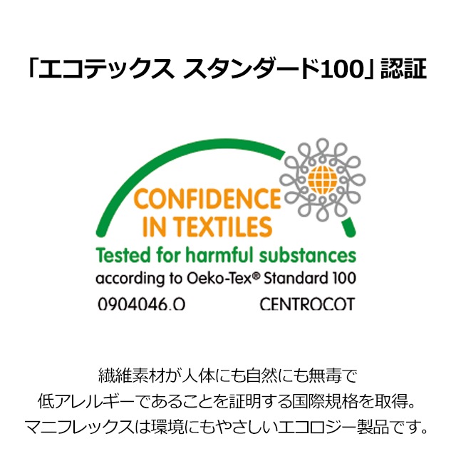 「オコテックス(Oko-Tex)スタンダード100」認定製品だから、人体の健康に一切無害。防ダニ・防虫加工も済。また、製造から廃棄処理の過程まで一切の有害物質を排出しないエコロジー製法なので環境にも優しい。