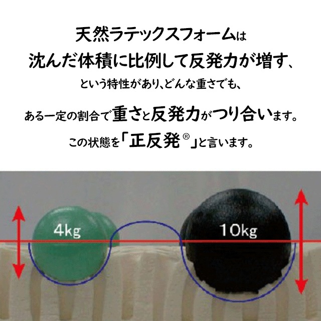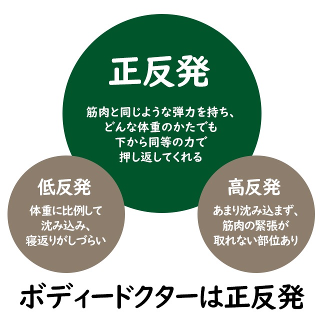 ボディドクターのラテックスは、人体の表面硬度に近い柔らかすぎず、硬すぎない独特の弾力性。適度な反発力が、寝返りをしやすくし、血行不良を防ぎ、熟睡の元となります。