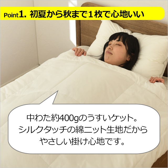 初夏から秋まで1枚でタオルケットのように快適に使えます。肌掛けのやさしいぬくもりも ありますから寝冷えの防止にも
