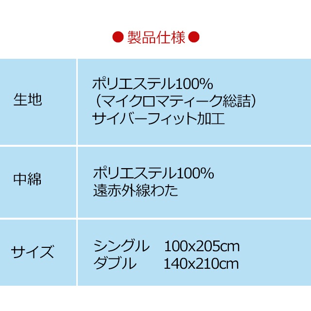 | 生地 | ポリエステル100% (マイクロマティーク総詰) サイバーフィット加工 |