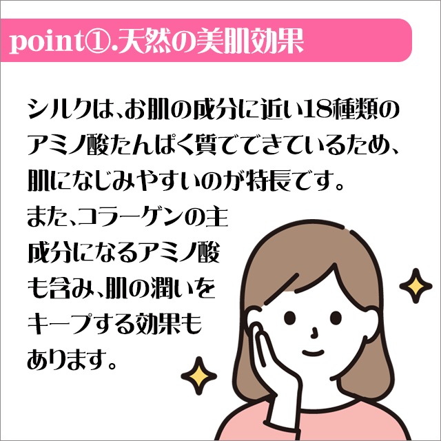 シルクは、お肌の成分に近い18種類のアミノ酸たんぱく質でできているため、肌になじみやすいのが特長です。
