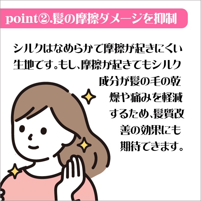シルクはなめらかで摩擦が起きにくい生地です。もし、摩擦が起きてもシルク成分が髪の毛の乾燥や痛みを軽減するため、髪質改善の効果にも期待できます。