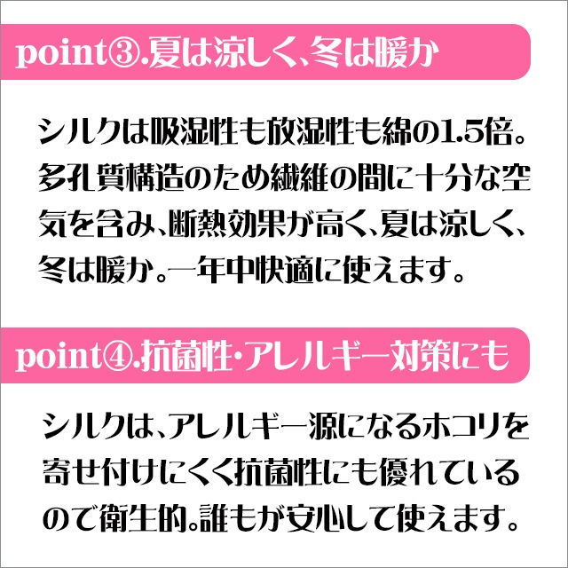 シルクは吸湿性も放湿性も綿の1.5倍。多孔質構造のため繊維の間に十分な空気を含み、断熱効果が高く、夏は涼しく、冬は暖か。一年中快適に使えます。