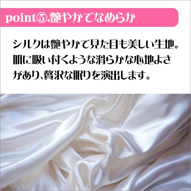 シルクは艶やかで見た目も美しい生地。肌に吸い付くような滑らかな心地よさがあり、贅沢な眠りを演出します。