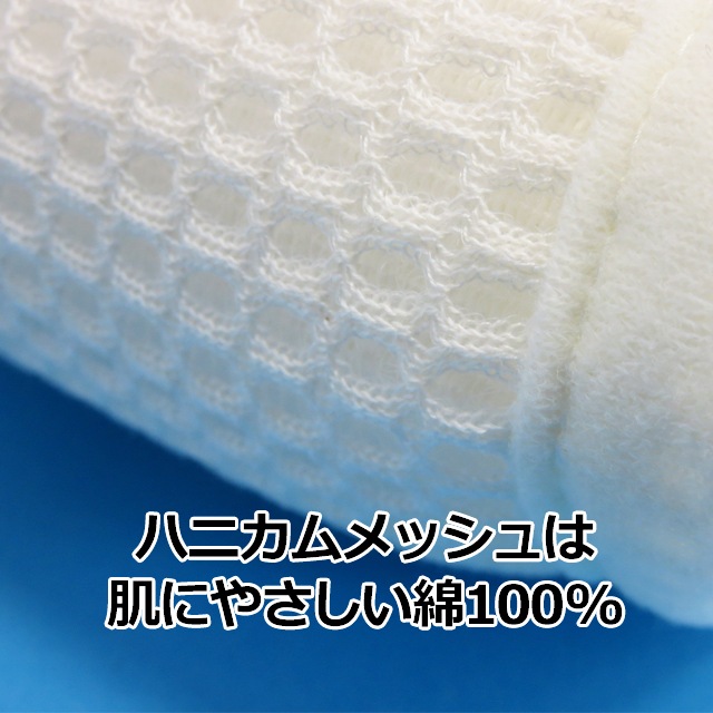 この敷きパットはハニカム構造の立体メッシュで中わたは入れてません。また、ハニカムメッシュはよくあるポリエステルではなく綿100%の糸で作られてますので、従来品よりべたつき感がより軽減されます。