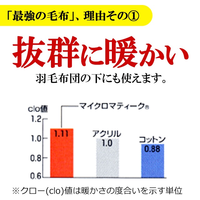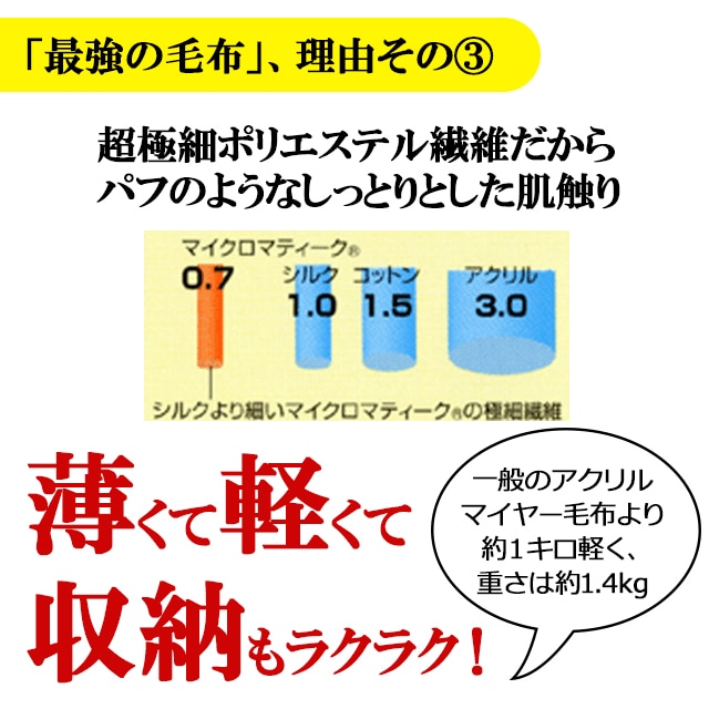 保温性抜群のあたたかい毛布です。シルクより細い超極細ポリエステル繊維ダクロンのマイクロマティークの毛布だから、軽くてあたたかく、吸水性、吸汗性があるので蒸れにくいのもうれしいです。
