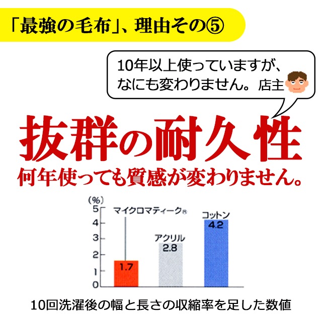 ご家庭の洗濯機で簡単に丸洗いができて冬でもすぐ乾き、制電効果でほこりがつきにくいので、ハウスダストやダニアレルギーの方にも安心してお使いいただけます。店主も10年以上愛用していますが毛玉もできず風合いも変わらず耐久性にすぐれた軽量で清潔な毛布です。寒がりの方へのプレゼントにも喜ばれます。