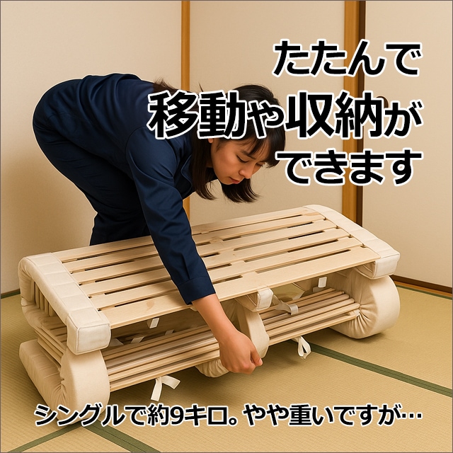 折りたたみ可能なので、移動や収納も簡単。お部屋の掃除もらくにできます。フロアでも、和室でも、フローリングでも使いやすく、ご家庭に高級旅館のような寝心地を実現します。組立不要で届いたその日からすぐにお使いいただけます。