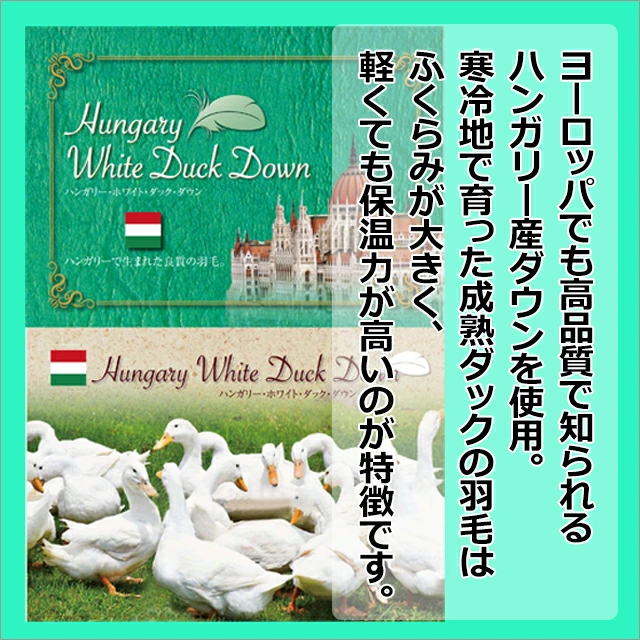 ヨーロッパでも高品質で知られるハンガリー産ダウンを使用。寒冷地で育った成熟ダッ クの羽毛はふくらみが大きく、軽くても保温力が高いのが特徴です。毎晩ふんわりと包 まれるような暖かさを実感できます。