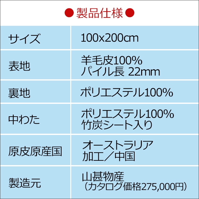 | 側生地 | 表地:羊毛皮100% パイル長 22mm 裏地:ポリエステル100% |