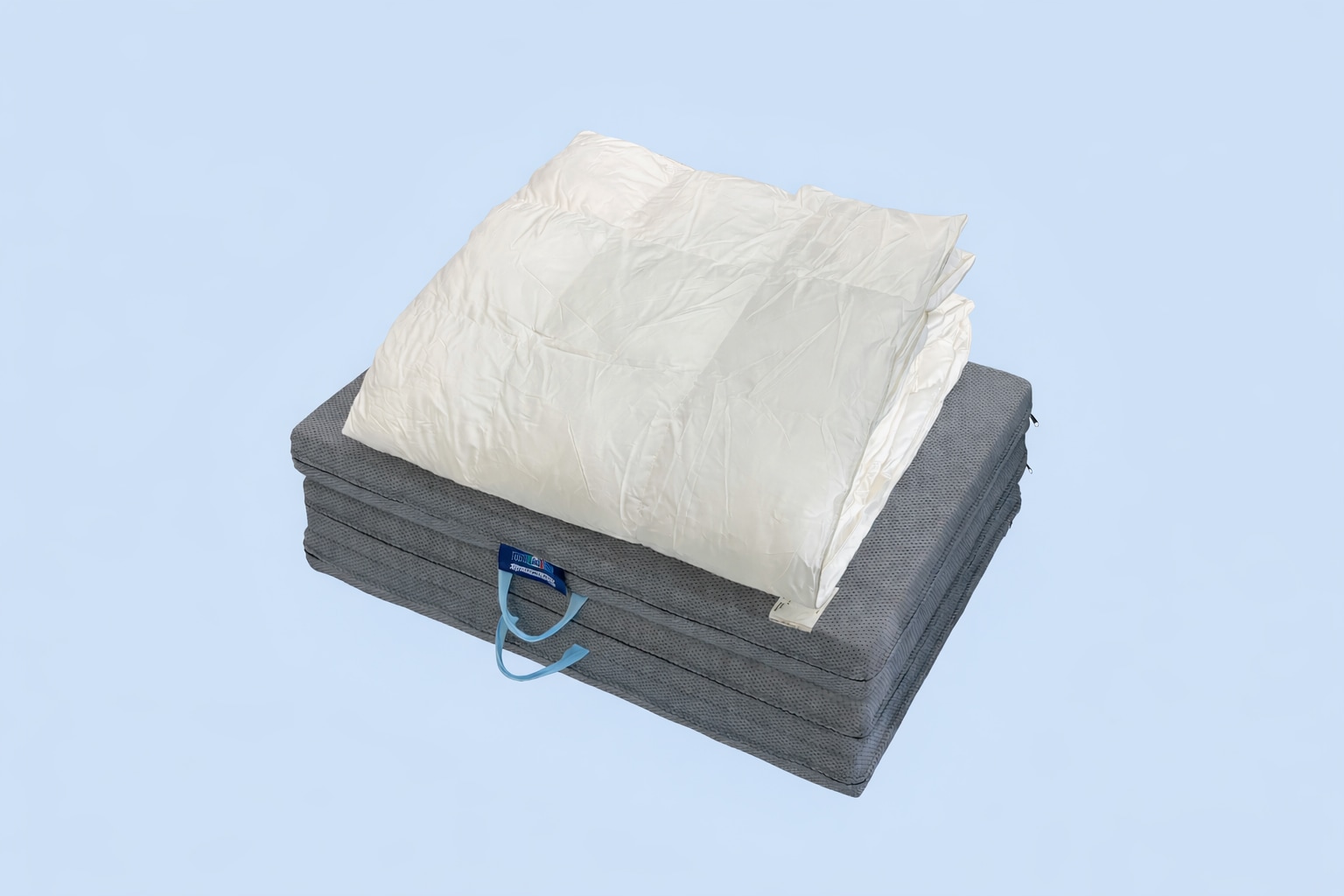 | 体をしっかり支えるマニフレックスの三つ折りマットレスと、羽毛ふとんのように軽くあたたかく、蒸れにくい掛けふとんの組み合わせです。 |